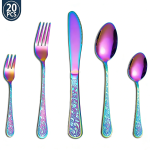 20 Pcs Rainbow Silverware Set Mirror Polished Stainless Steel Flatware Set Stylish Including Fork Spoon and Cutter for Dining Room Event Daily Meal
