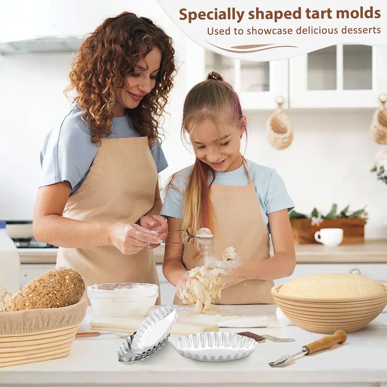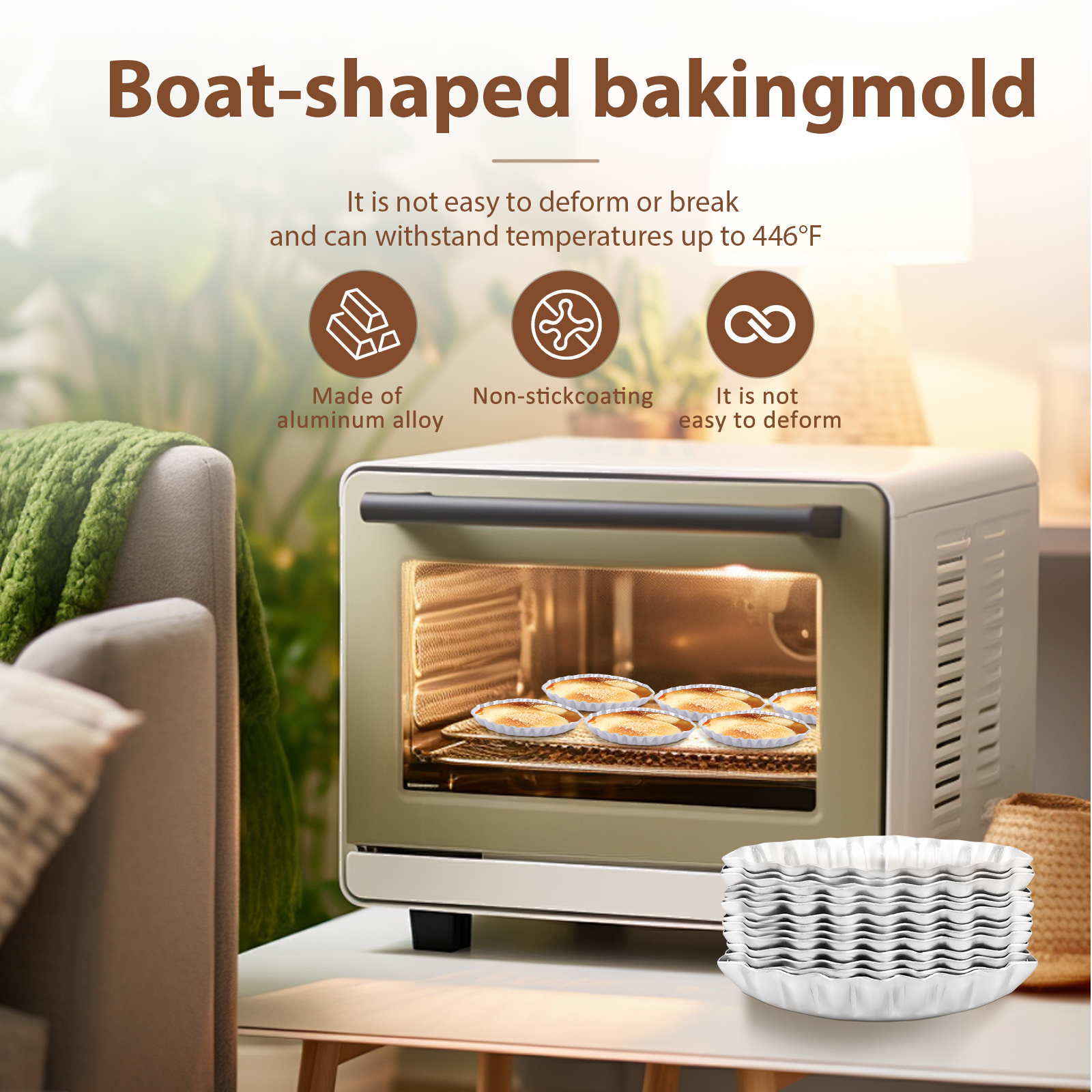 Aluminum Alloy Construction : The tart mold is made of aluminum alloy and non stick coating , which is not easy to deform or break , can withstand temperatures up to 446°F , and can be used repeatedly in daily life