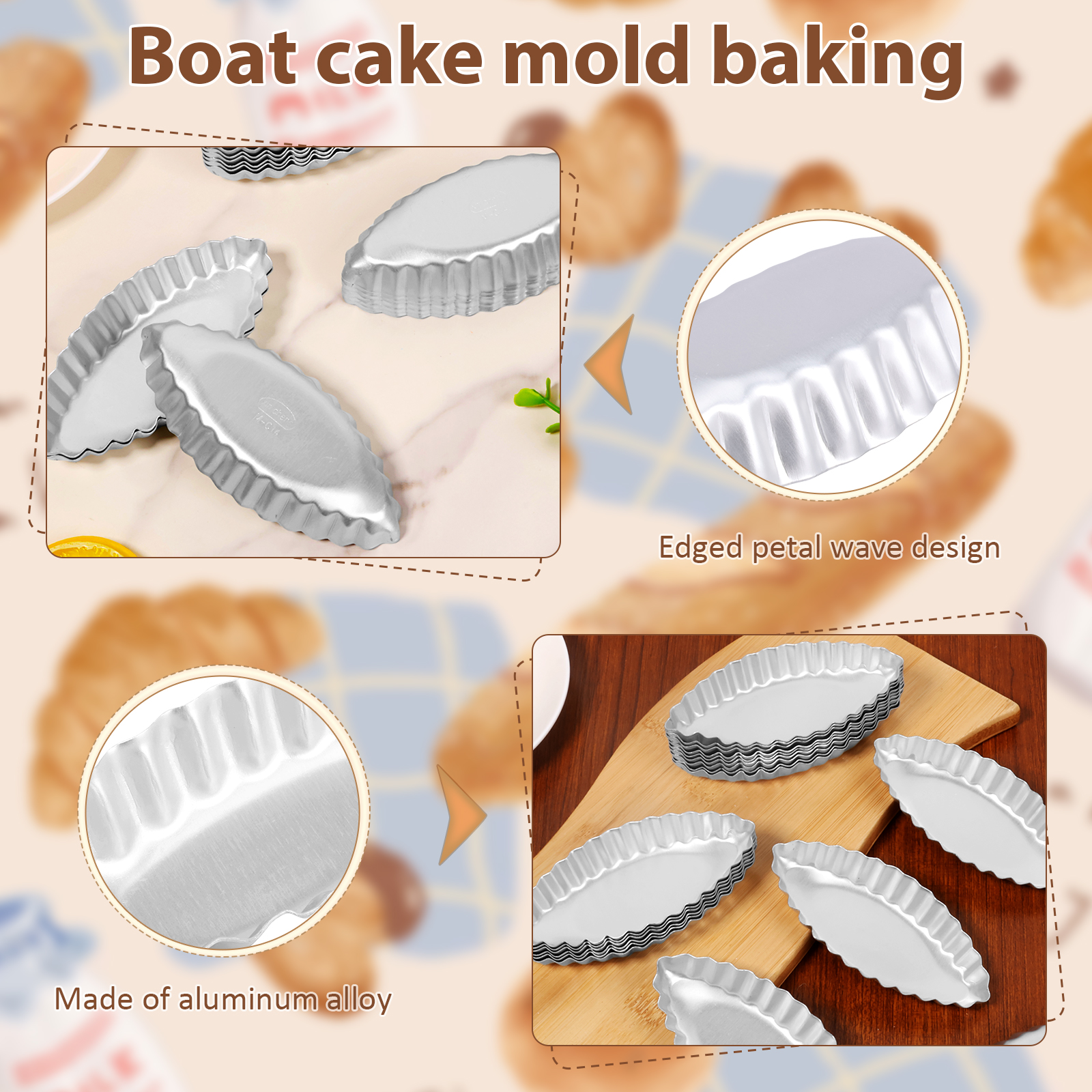 These boat shape egg tart mold is made of aluminum alloy , which is safe for food contact . With fluted sides and boat shape , the dessert turns out to be beautiful and cute . Suitable for DIY making different lovely desserts , such as jello , sweet , lemon tart , fruit pie , pudding for parties , dinner , snacks .