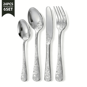 24 Pcs Floral Silverware Set for 6 Stainless Steel Utensil Set Including Fork Spoon and Knife Mirror Polished for Home Restaurant Dishwasher Safe
