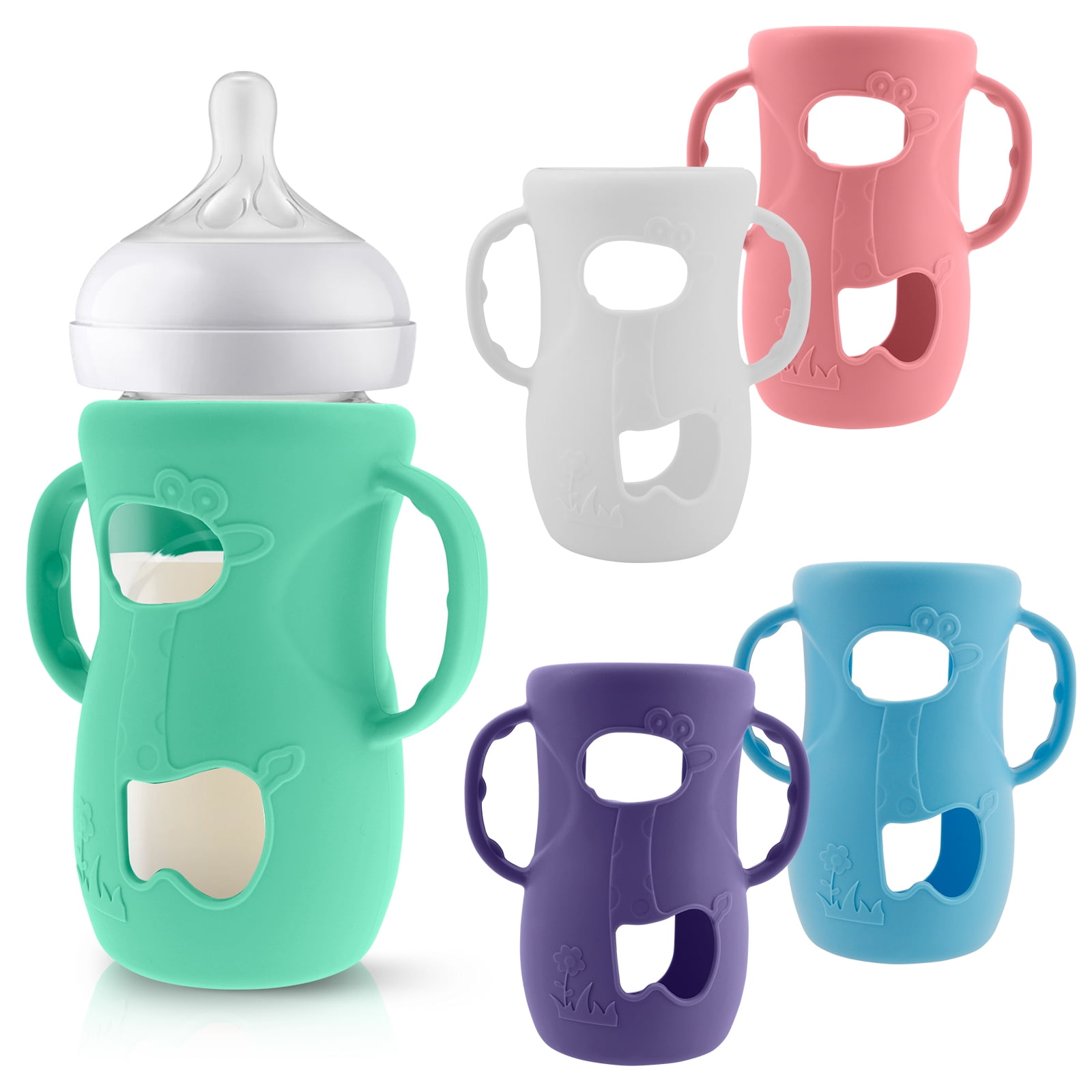 5 Pcs Easy Grip Baby Bottle Holder Anti Breakage Glass Bottle Silicone Sleeve with Handle and Window for Newborn Boy Girl