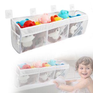 Bath Toy Storage Net,3 Compartment Hanging Organizer with 2 Side Pockets & 4 Adhesive Hooks,Mesh Bath Toy Caddy for Easy Access & Sorting,Baby Kids Toddler Bathtub Storage