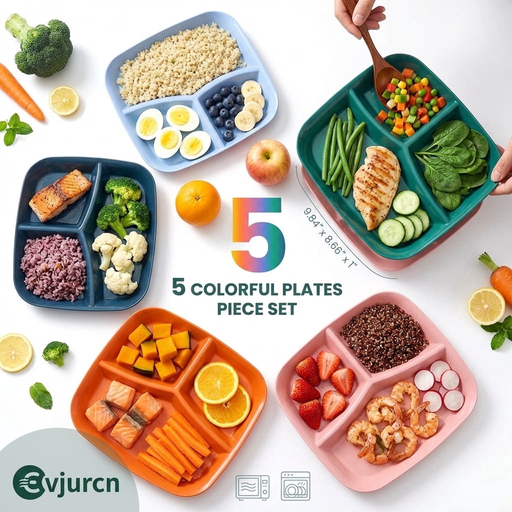 Evjurcn 5Pcs Divided Dinner Plates 3 Compartments Divided Dinner Plate Stackable Portion Control Plates Reusable Divider Plates for Kids and Adults Microwave and Dishwasher Safe