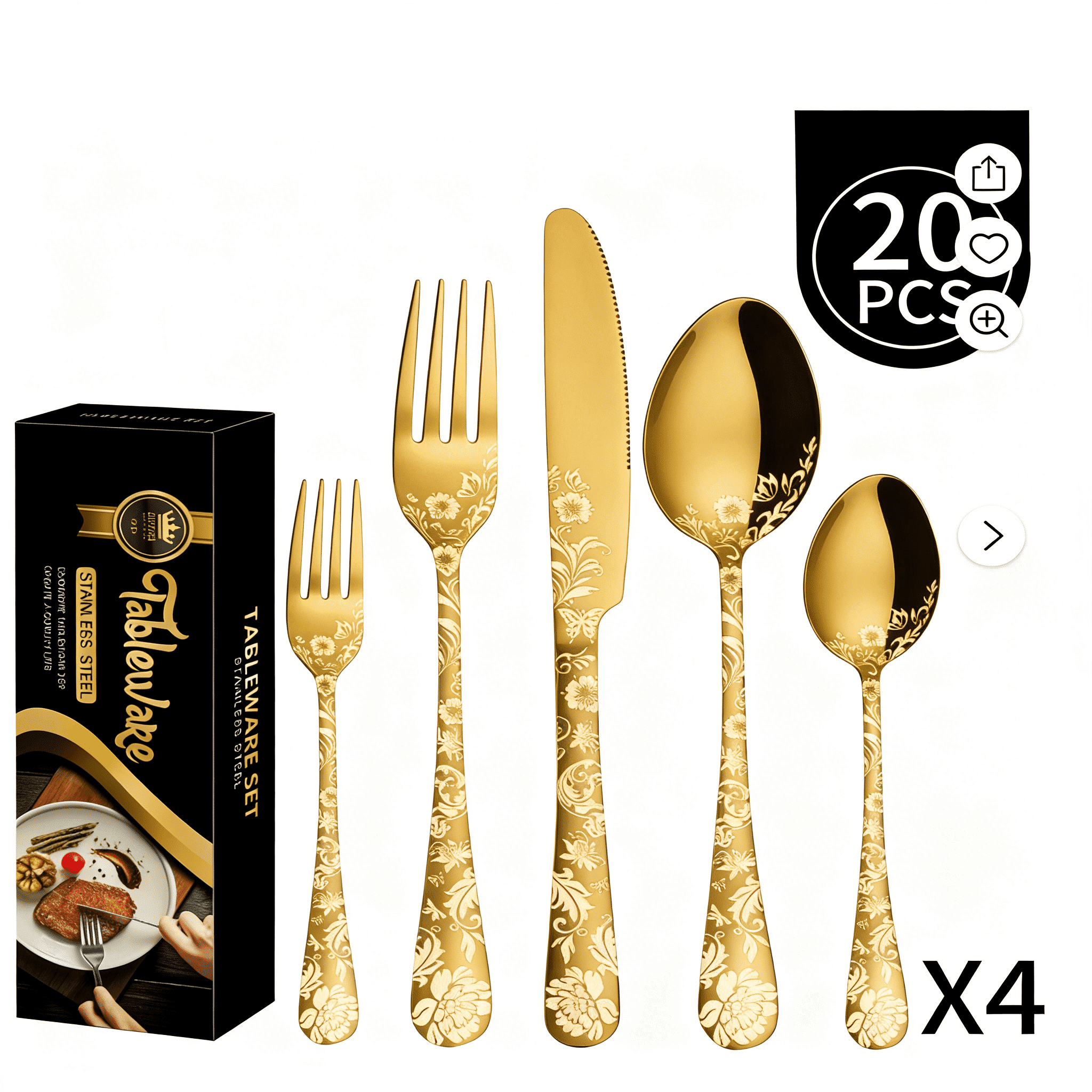 Jetcloudlive 20 Piece Gold Silverware Set Service for 4, Stainless Steel Flatware Set, Mirror Polished Cutlery Set, Flower Pattern Forks and Spoons Set with Knives, Dishwasher Safe