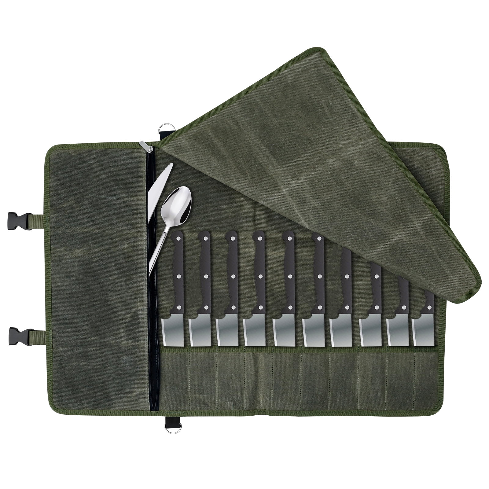 Knife Roll Bag Waxed Canvas Chef Knife Bag 10 Slots Large Kitchen Knives Cases with Zipper Pocket for Chefs Culinary Traveling