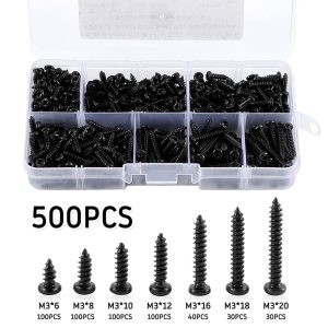 Rzvnmko 500 PCS M3 Black Self Drilling Screws, Round Head Self-tapping Screws for Soft Wood Metal, with Plastic Box