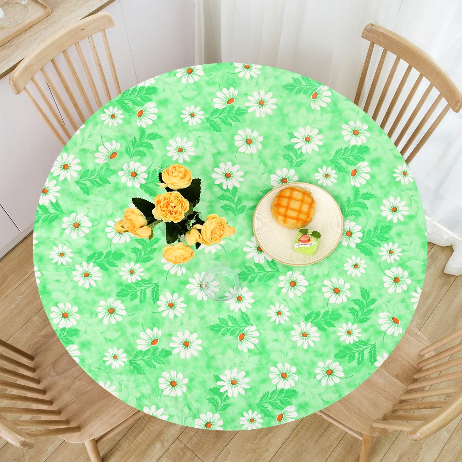 Tcwhniev Indoor Outdoor Patio Round Fitted Vinyl Tablecloth, Flannel Backing, Elastic Edge, Waterproof PVC Table Cover, Green Daisy Pattern for 6-Seat Table of 44-55???? Diameter