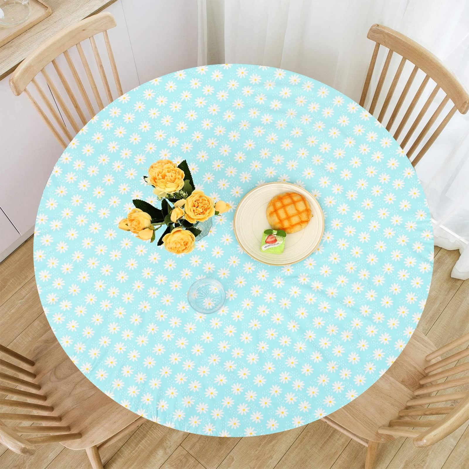 Tcwhniev Indoor Outdoor Patio Round Fitted Vinyl Tablecloth, Flannel Backing, Elastic Edge, Waterproof PVC Table Cover, Small Daisy Pattern for 6-Seat Table of 44-55???? Diameter