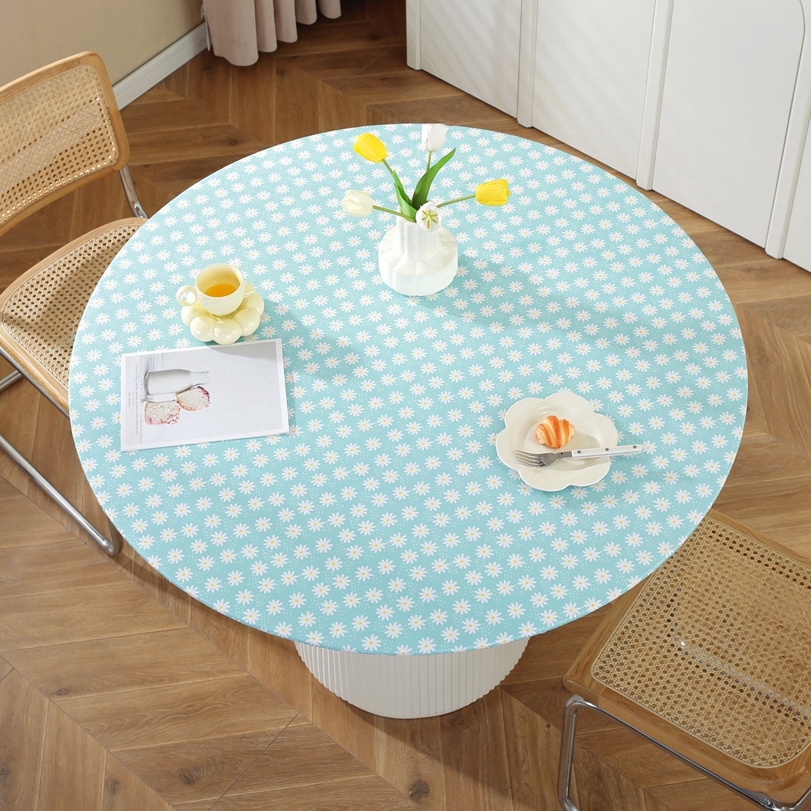Tcwhniev Indoor Outdoor Round Fitted Vinyl Tablecloth, Flannel Backing, Elastic Edge, Waterproof Wipeable PVC Table Cover, Small Daisy Pattern, for Table of 43-55???? Diameter