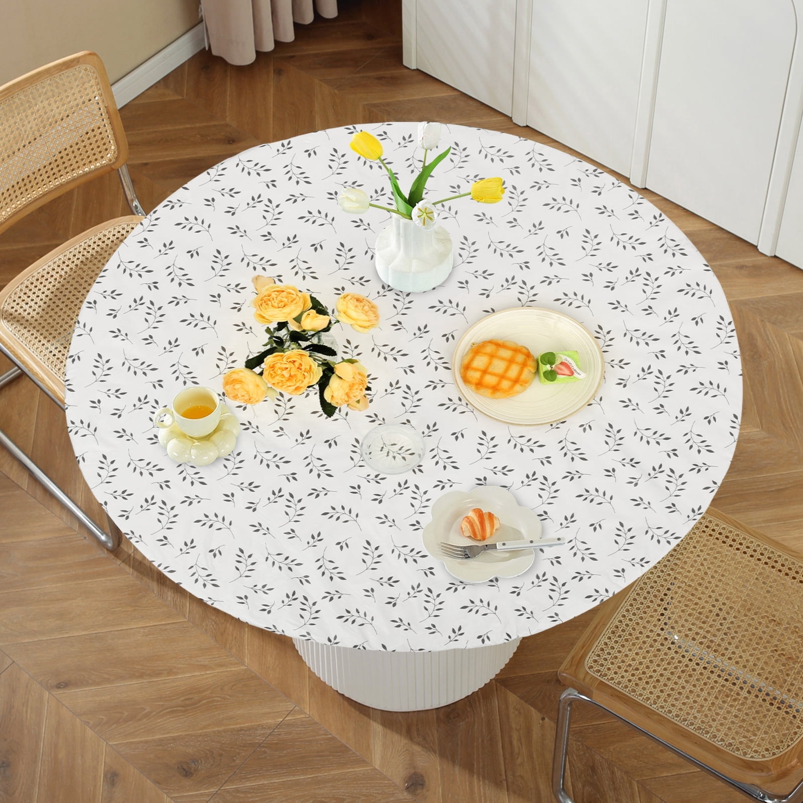 Tcwhniev Indoor Outdoor Round Fitted Vinyl Tablecloth, Flannel Backing, Elastic Edge, Waterproof Wipeable PVC Table Cover, Small Leaf Pattern, for Table of 43-55???? Diameter