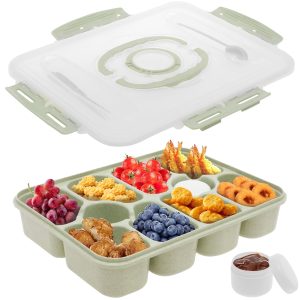 Tcwhniev Snackle Box Container, 10-Compartment Divided Serving Tray with Lid and 1 Fork, 1 Spoon, Built-in 2 Sauce Containers, Portable Snack Tray for Party, Picnic, Perfect for Fruit, Candy and Trea